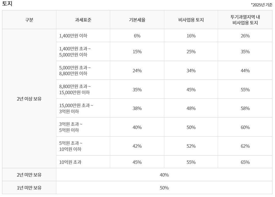 2025년 양도소득세율표 (주택, 토지, 건물 등)