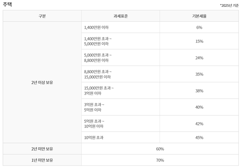 - 단기 보유 주택 (1년 미만: 70%, 2년 미만: 60%) 및 비사업용 토지 등에 대한 세율은 위 표와 다르게 적용됩니다.