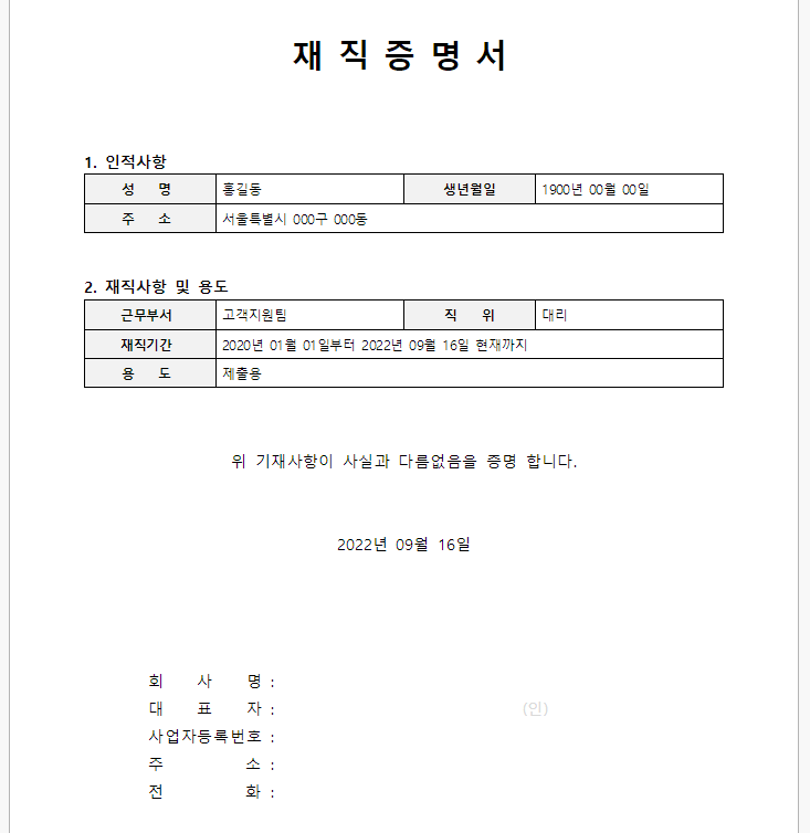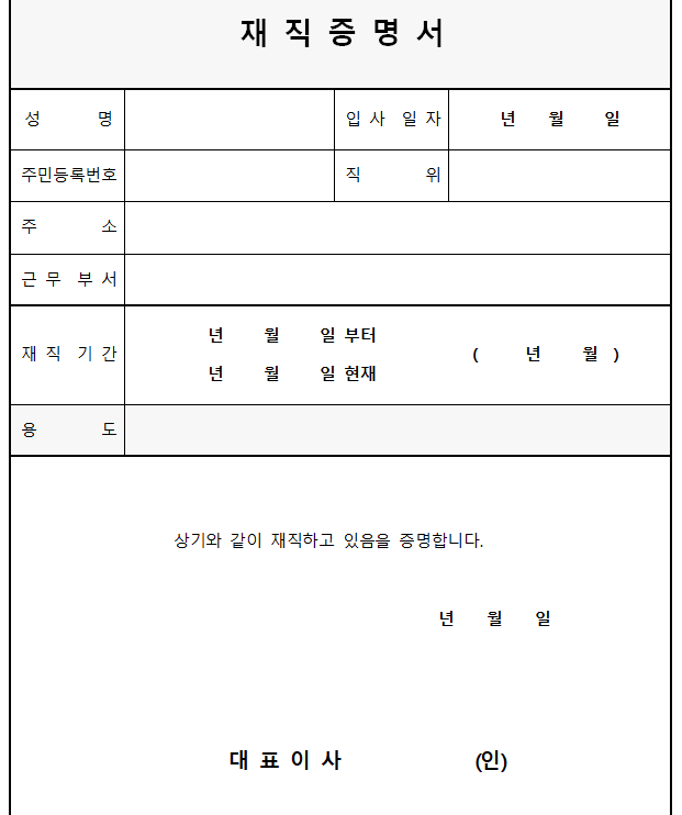 | 목적 | 현재 재직 사실 증명 | 과거 근무 경력 증명 |